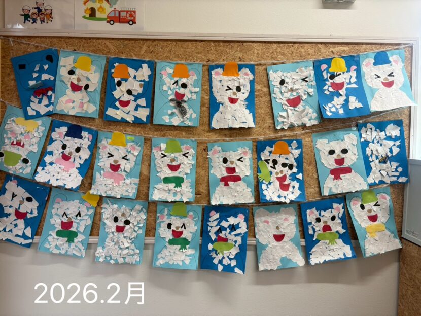 水のりが手につくのを嫌う児童が多い為、筆を使って糊付け。いろんな表情の白くまくんが出来上がりました。