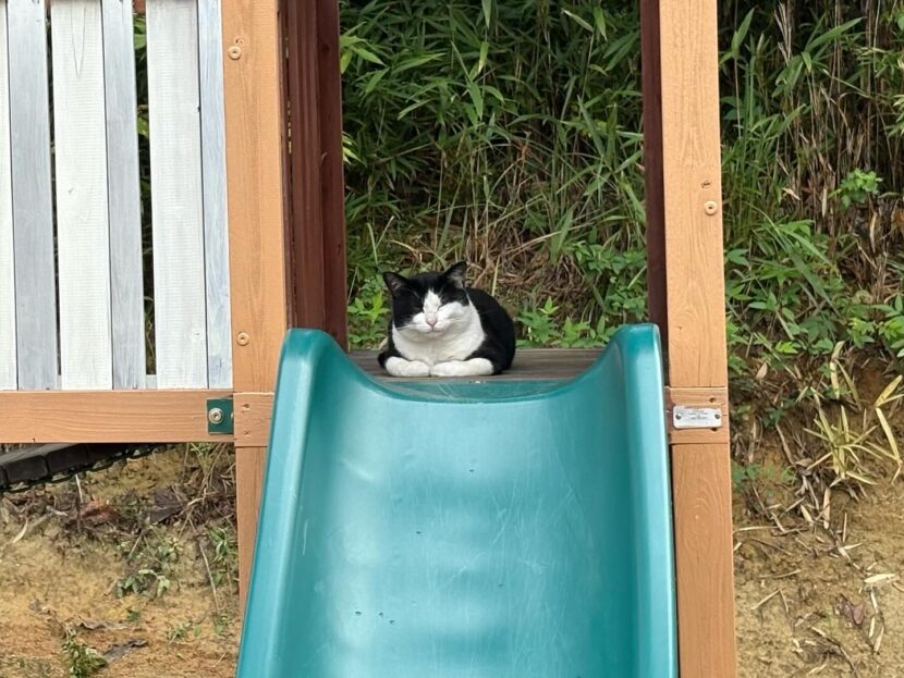 はたらく車(🚓パトカーに佐川急便、JAFなど)を間近で見てきました。スタンプラリーにも参加して、ミッションクリア👍🏻お出かけしやすい気候になってきましたね。お出かけ以外にも外遊びも出来る季節。そろそろふれあいの遊具で、子どもたちにも体を動かしてもらおうと、今朝滑り台を覗いてみると、ネコちゃんがまったり占領🤣ネコちゃんにも大人気の大型遊具です❣️