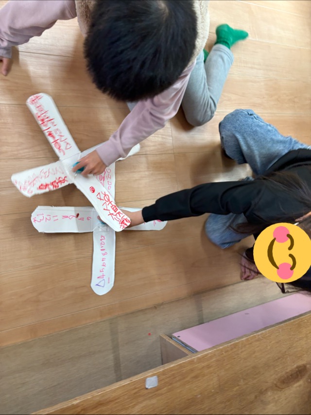 コマの製作の後のコマ回し大会❣️コマの羽には「ママ大好き😍」と素敵なメッセージを書いたS君。ほっこり暖かい気持ちになりました。